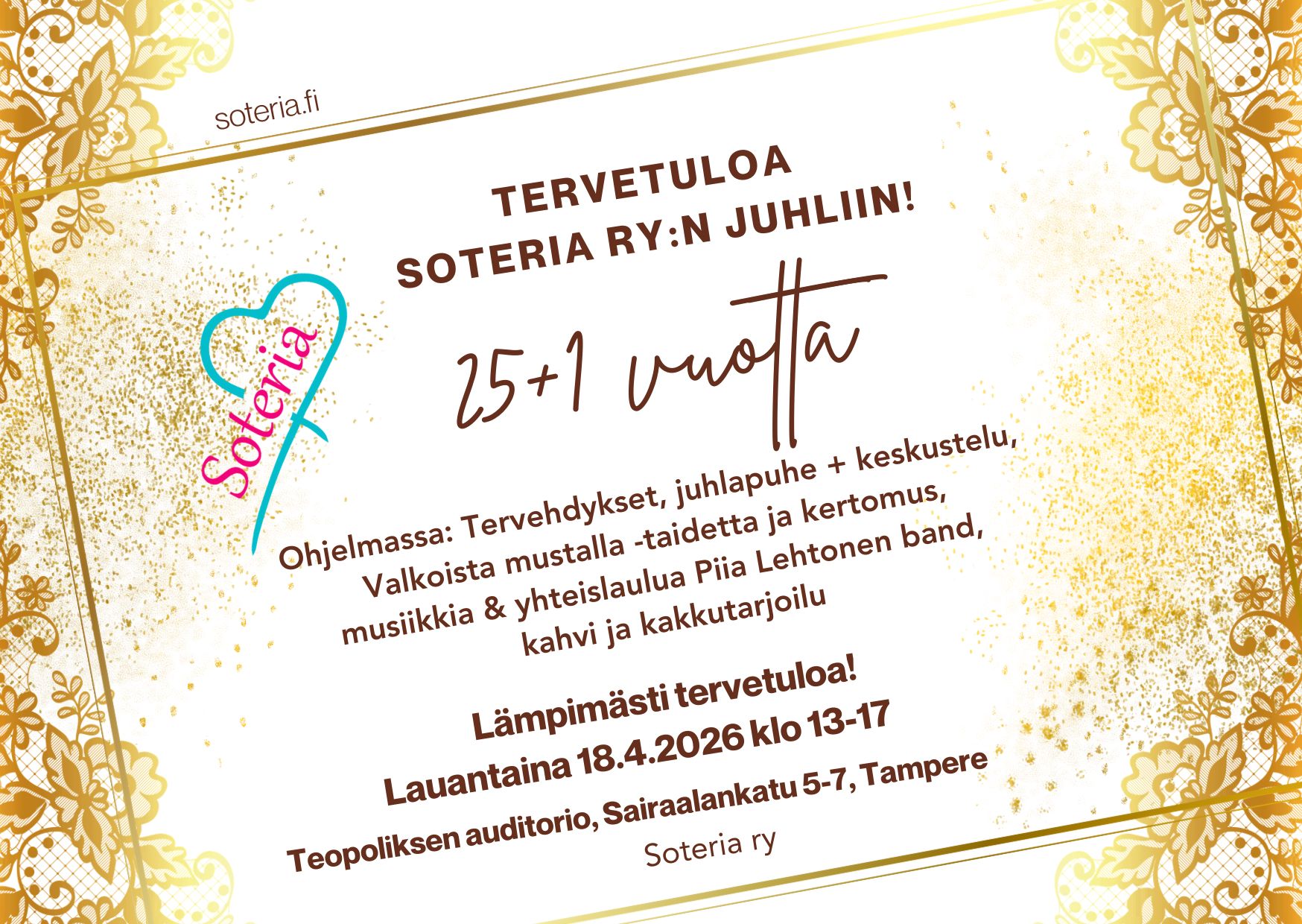 Tervetuloa 18.4.2026 klo 13 Soterian 25+1 juhliin Teopoliksen Auditorioon,